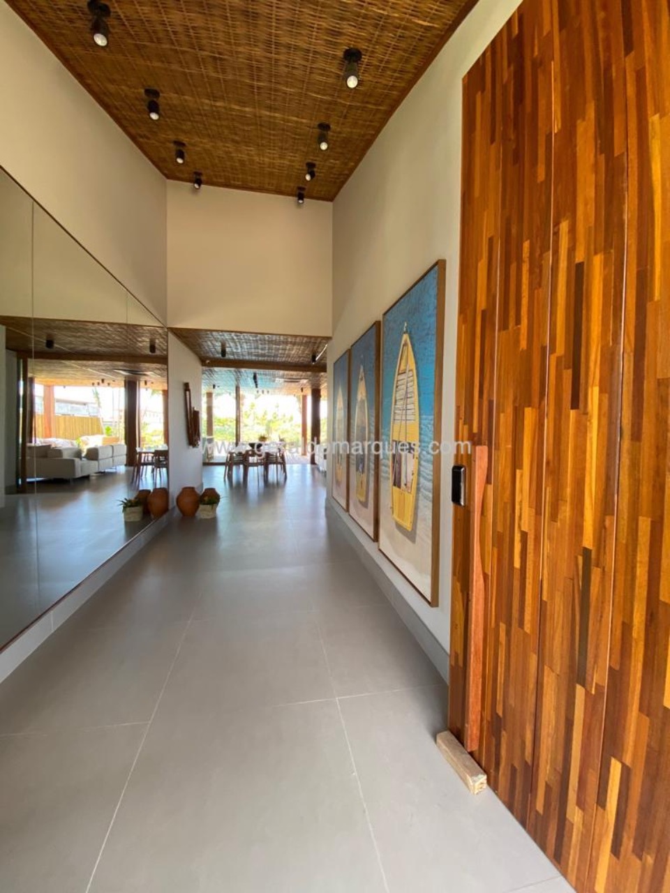Pergolado externo coberto e revestido em palhinha decorativa com fechamento com toldos elétrico.